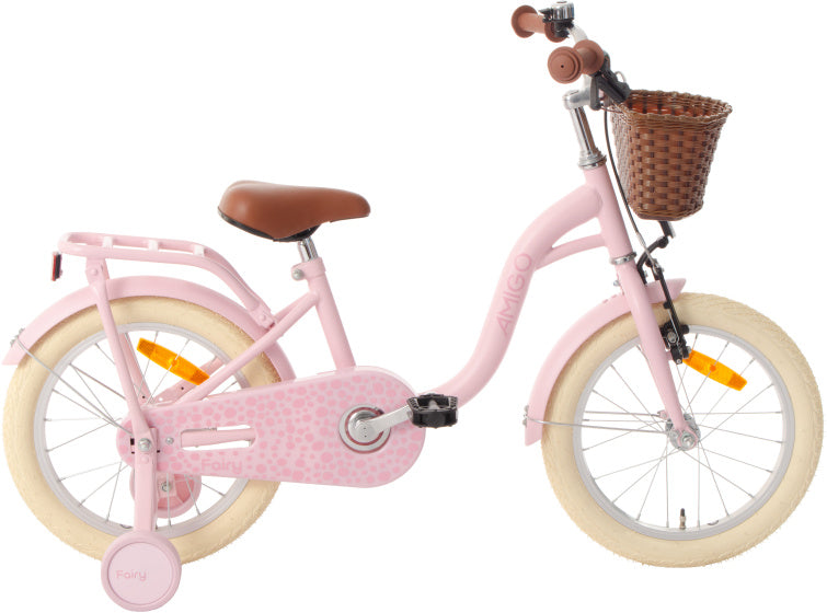 Laat je betoveren door het magische karakter van de AMIGO Fairy! Deze 16 inch kinderfiets heeft een prachtige mintgroene pastelkleur én een sprookjesachtige print op de kettingkast. De bruine handvatten, het zadel en de banden geven een leuke twist aan het geheel. Maar ook het frame is uniek dankzij de enkele bovenbuis. De meisjesfiets heeft naast een bagagedrager ook een fietsmand. Speciaal voor al jouw (school)spullen of een gezellige picknick! Al wat verder gevorderd met oefenen? Probeer dan eens een rondje zonder de zijwielen.