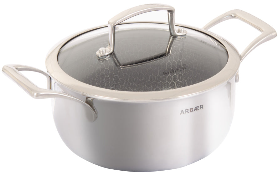 Arbaer kookpannen zijn opgebouwd uit een unieke 3-ply technologie van twee lagen RVS en een éxtra dikke laag aluminium. De aluminium laag verzorgt de warmtegeleiding en is bij Arbaer pannen tot wel 50% dikker dan andere pannen in de markt. Deze dikkere laag aluminium, die ook is verwerkt in de zijwanden, is energiebesparend doordat je op lager vuur kookt én zorgt voor een snelle en perfecte warmteverdeling. Zo kookt het water bijvoorbeeld aanzienlijk sneller! Door deze 3-ply technologie is de pan ijzersterk, snel op temperatuur en ook nog eens vaatwasser bestendig.